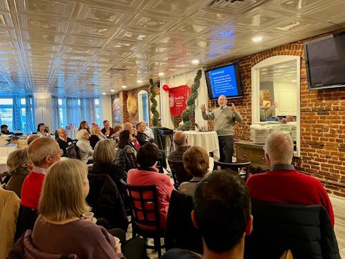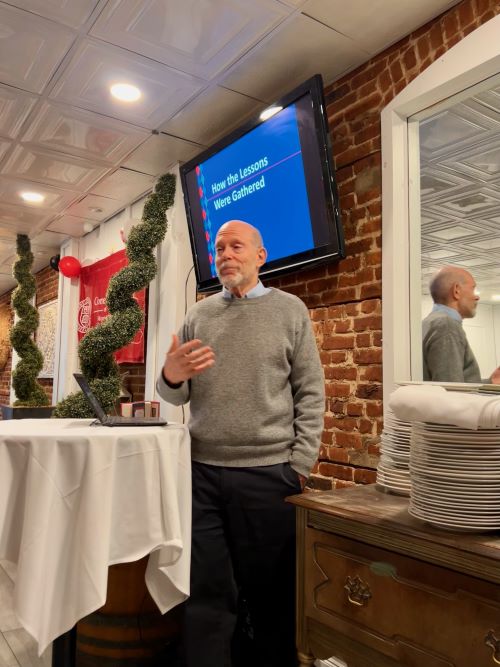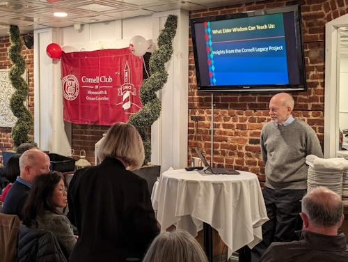 Prof. Pillemer shared video snippets from his Legacy Project, where he interviewed 1,200 elderly people in depth about what they learned over their lives. Among the lessons learned: The talk and dinner were held at Johnny Piancone's restaurant in Long Branch.